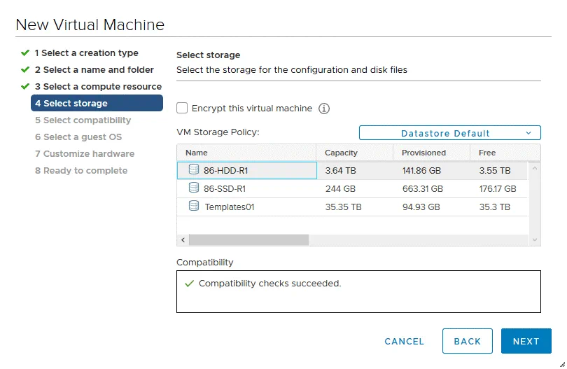 4. Select storage. Select a datastore where the virtual machine files, including the virtual disk files, will be stored. Make sure that there is enough free space on the selected datastore. In this example, the 86-HDD-R1 datastore is selected.