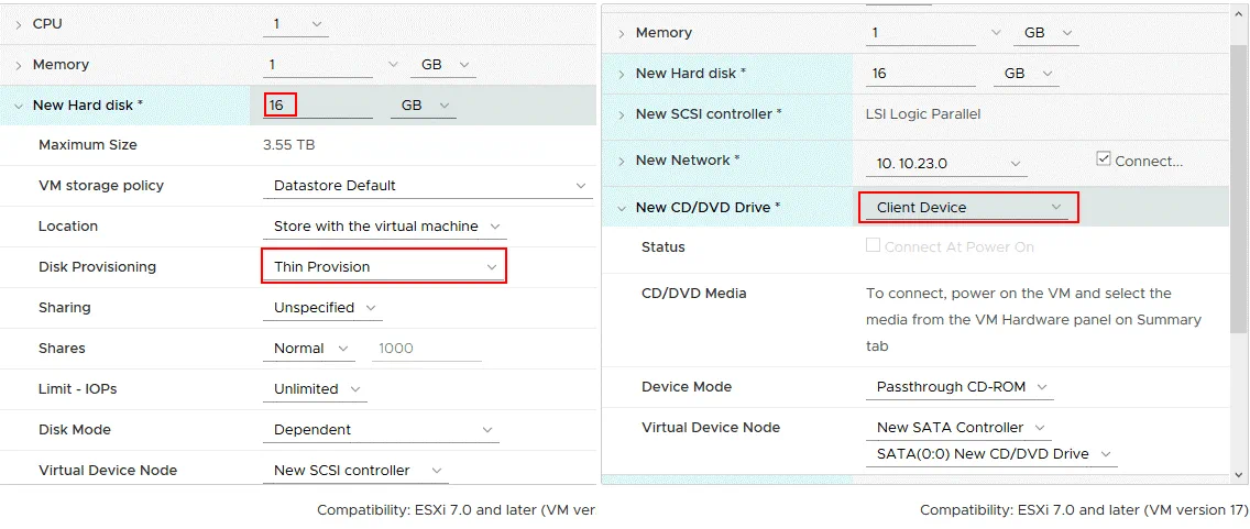 New Hard disk – select the size of a virtual hard disk and the provisioning type. You can select Thin Provision, Thick Provision Lazy Zeroed, or Thick Provision Eager Zeroed. Read more about Thick and Thin provisioning in the blog post. If your new VM needs to use multiple virtual disks, you can create more disks by clicking Add New Device > Hard disk. Similarly, you can add network adapters, CD-ROM, and other devices. It is possible to edit VM settings after VM creation. Thin Provision is used in the current example.
