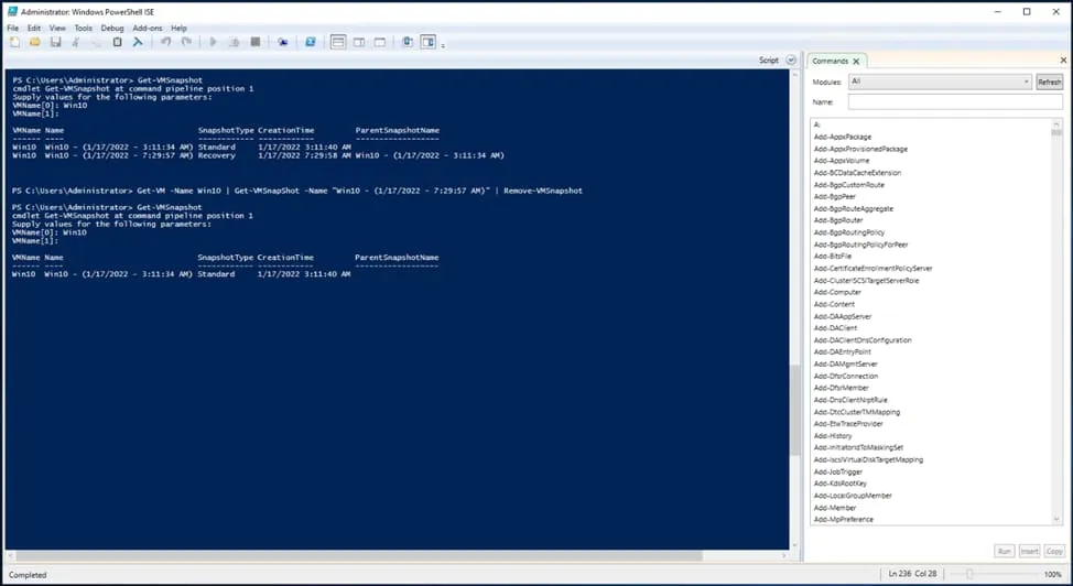 To perform bulk actions on Hyper-V VMs, Windows PowerShell is more efficient than the Hyper-V Manager GUI as you can use commands to delete multiple snapshots at once. Besides, some actions, such as deleting a checkpoint that has no delete option in the GUI, can only be accomplished via PowerShell.