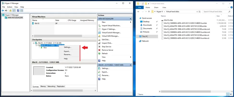 In the screenshot below, you can see one parent .vhdx virtual disk and two .avhdx disks after creating two Hyper-V checkpoints for a VM.