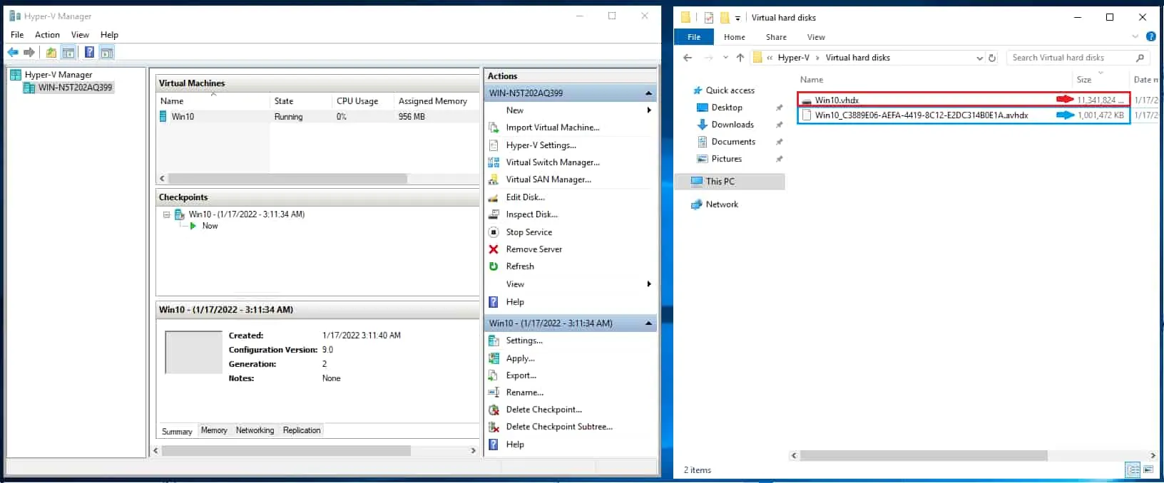 In the screenshot below, you can see a parent .vhdx virtual disk and an .avhdx snapshot file after deleting the second Hyper-V checkpoint.