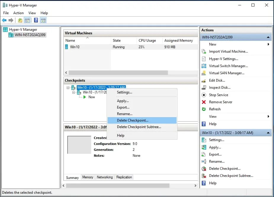 In the next section, we will show how to delete snapshots (checkpoints) from the Hyper-V Manager interface without losing data.