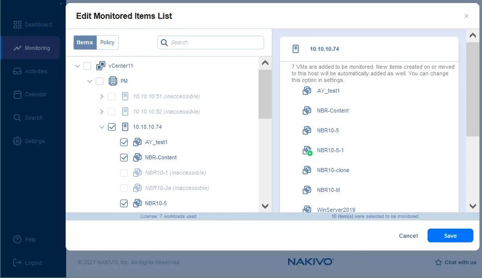 - Select particular VMs, ESXi hosts, or the entire vCenter servers you want to monitor. In our example, we select to monitor one ESXi host and all VMs residing on this host.