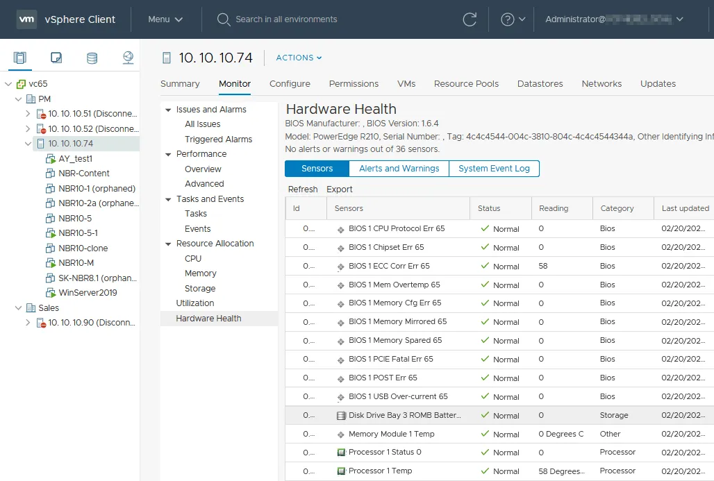 - Select the needed monitored parameter to see detailed information, for example, Hardware Health. There are sensors on the server hardware that display information about CPU temperature, motherboard temperature, fan speed (RPM), etc.