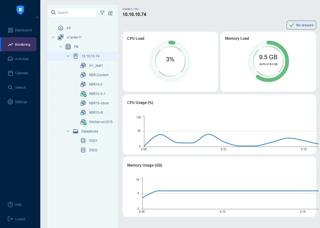 Now you can click the Monitoring button in the left pane of the NAKIVO web interface, select the needed items for VMware monitoring, and view the provided information.