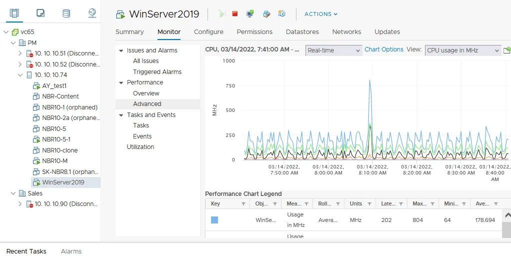 - Select the Monitor tab, similarly as explained for an ESXi host for VM performance monitoring. Select the needed VMware monitoring parameter for the VM. In this example, we go to Performance & Advanced and select to monitor VM CPU usage in MHz.