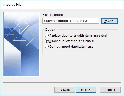 Select a CSV contacts file to import. Click Browse, select the CSV file needed, then select what the system should do if duplicates are found in the contact list. I select Allow duplicates to be created, which is the default option. Select this option if you are not sure of which file contains more recent or more complete contacts – the existing contact list of Outlook or the CSV contacts file that you are importing. You can select Replace duplicates with items imported if you know that the contacts in the CSV file are more current or select Do not import duplicate items if you are sure that items in the imported CSV contacts file are older than the same contacts existing in Outlook Online contact lists.