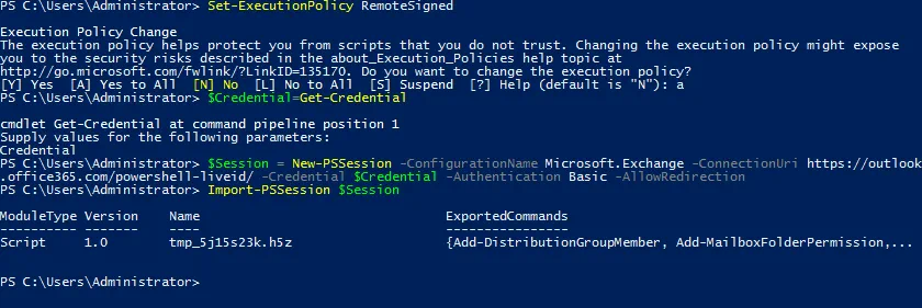 Import cmdlets of Exchange Online to the established session in PowerShell:
