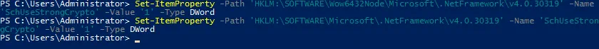 Set-ItemProperty -Path 'HKLM:\SOFTWARE\Microsoft\.NetFramework\v4.0.30319' -Name 'SchUseStrongCrypto' -Value '1' -Type DWord