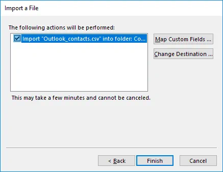 At this step, you can select the actions that will be performed. Click Map Custom Fields and Change destination to configure additional options. Outlook maps fields from the CSV file to the appropriate fields of the Outlook contact list automatically. These options should be edited if for any reason Outlook doesn’t map fields correctly. Hit Finish to start the process and import CSV to Outlook for importing contacts. Wait for a while and don’t cancel the operation.
