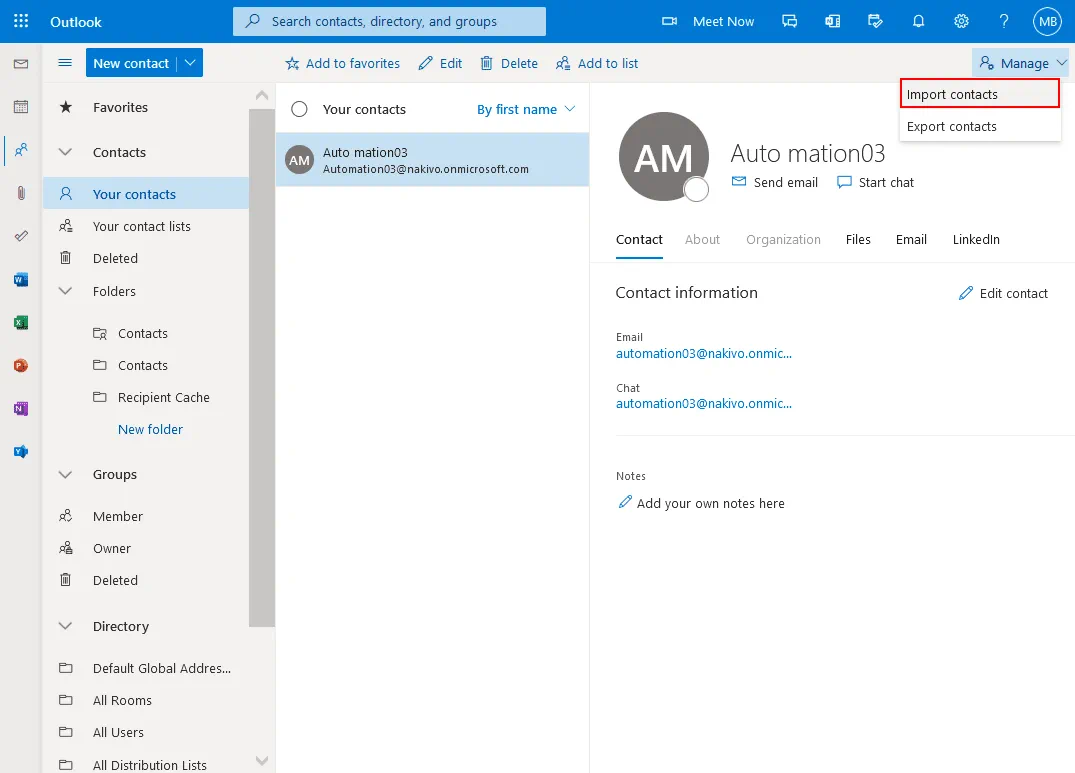 This blog post explained how to import contacts into Outlook in three popular cases including by using Outlook Online and Microsoft Office Outlook. You can import Outlook contacts to Outlook Online by using a graphical user interface, which is convenient for most users, and the command line interface in PowerShell, which can be useful for administrators who need to automate tasks when they import contacts into Outlook for many users.