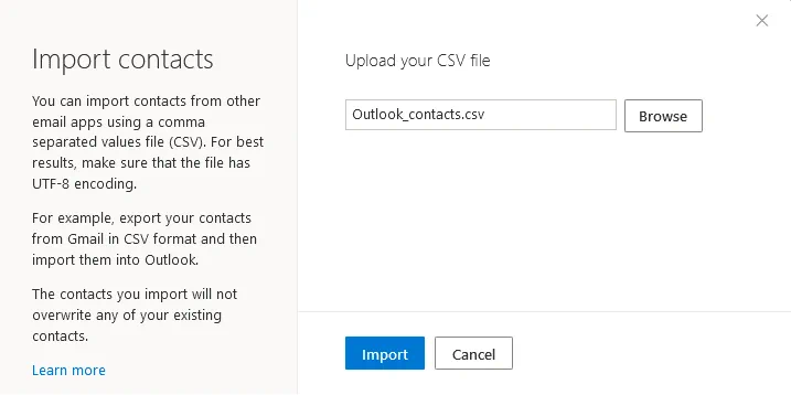 How to upload contacts to Outlook? In the Import contacts window that opens, find your CSV contacts file and upload this CSV file with Outlook contacts to Microsoft 365. Click Browse, select a file to upload, then click Import to proceed. Read the recommendations displayed in the left pane of this window. In a CSV file, data fields are separated with commas. Use UTF-8 encoding for the Outlook CSV format as compatibility is better. You can use this method to import CSV contacts not only from Outlook, but also from Gmail and other email services and clients when migrating to Microsoft 365. A CSV file is the Outlook contacts file in this case.