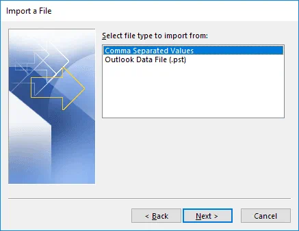 To import a file, select the file type to import from: Comma Separated Values. Outlook also supports import/export by using PST files.