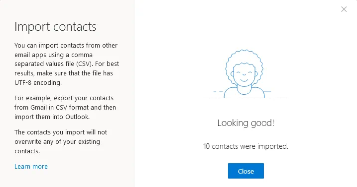 Once the import contacts into Outlook upload is finished, the Looking good message is displayed. In my case, 10 contacts have been imported. Click Close to close this window and go back to the Contacts page in Microsoft 365.