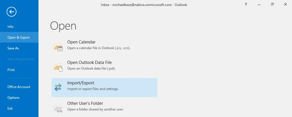 To start the process, open Microsoft Office Outlook, click File, select Open & Export in the left pane of the window, and hit Import/Export.