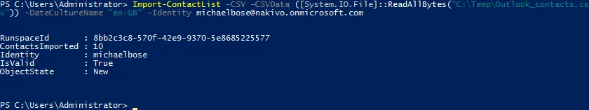 Import-ContactList -CSV -CSVData ([System.IO.File]::ReadAllBytes("C:\Temp\Outlook_contacts.csv")) -DateCultureName "en-GB" -Identity michaelbose@nakivo.onmicrosoft.com