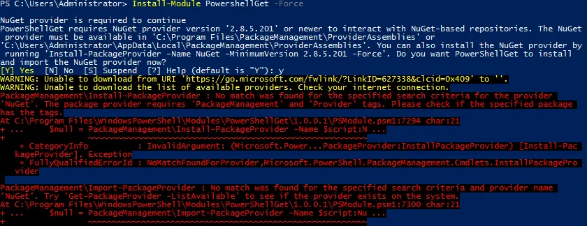 You can get an error when executing this command if the PowerShellGet module (the NuGet provider) cannot be installed.