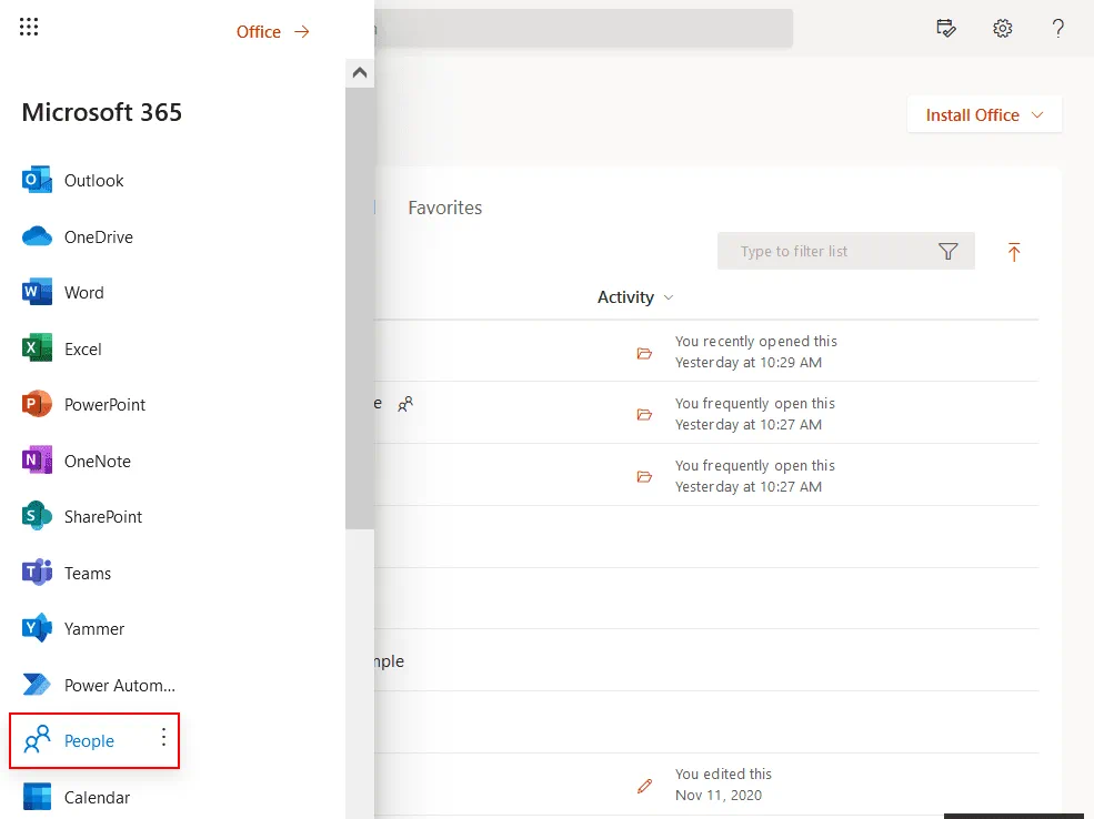 The menu that opens has a list of online applications. Click People to see Outlook contacts. Unlike standalone versions, Outlook in Microsoft 365 shows contacts as a separate app and not inside Outlook.