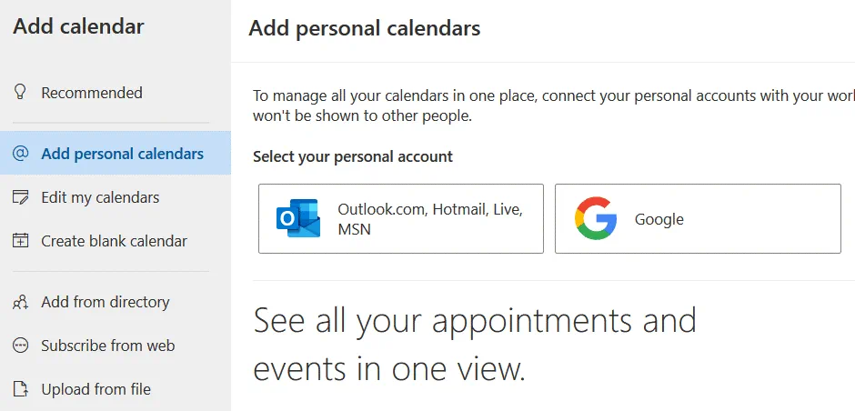 You can select Add personal calendars, select Google, sign in to a Google account and follow the instructions for adding a Google calendar to your Office 365 account.