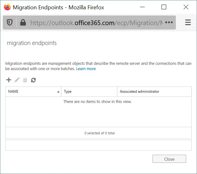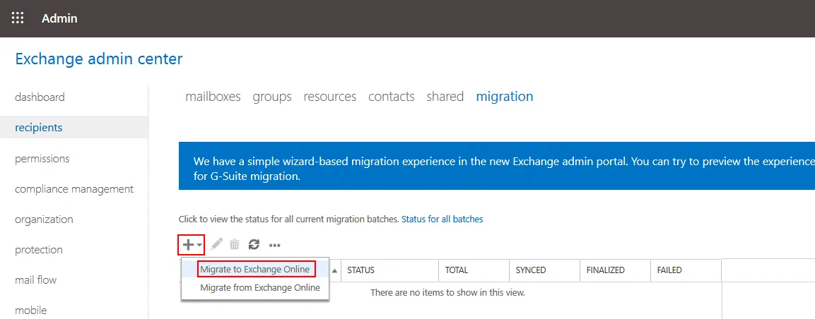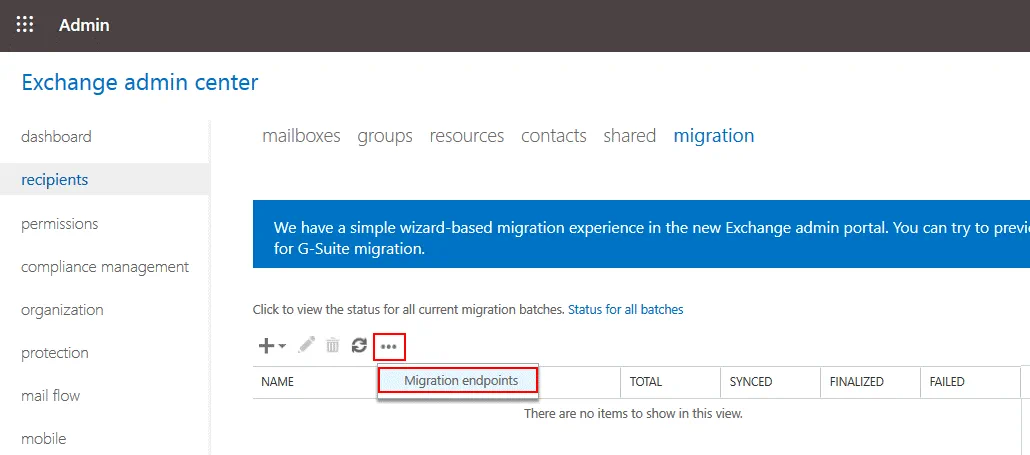 Go to Recipients > Migration, click the three dots (…) and click Migration endpoints.
