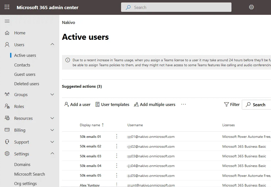 The next step is adding users to your Office 365 organization account in the Microsoft 365 admin center. Each user requires a license, that’s why you have to pay for a selected Office 365 subscription plan for your organization before you can activate added users. Each user must have a mailbox in Office 365 before you can migrate G Suite to Office 365, including email and other data. It is recommended that you create usernames that are similar to usernames used for Gmail accounts to avoid confusion, for example, robert_smith@mail.domain.com and robert_smith@o365.domain.com.