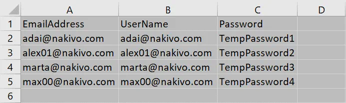 Similarly fill the first column (A) with the appropriate email addresses of the users that you have created in Office 365.