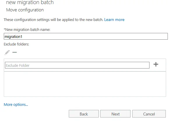 Enter a name for a new migration batch, for example, migration1. If you don’t want to migrate some folders, click the minus (–) icon and select folders that should be excluded from the migration when you migrate from G Suite to Office 365.