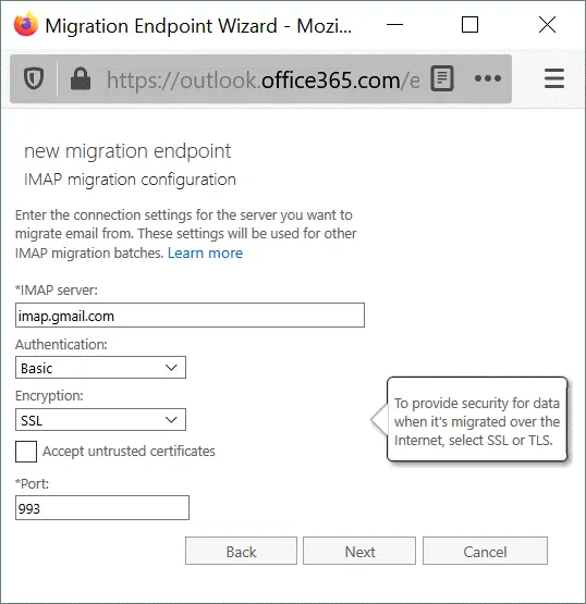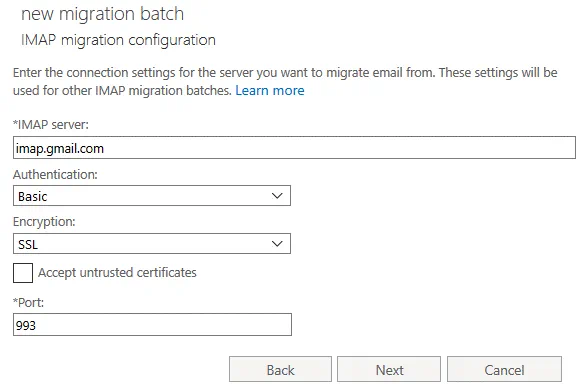 IMAP settings must be set to enable connection to Google servers, authenticate users, and copy their mailbox data to Office 365 accounts.
