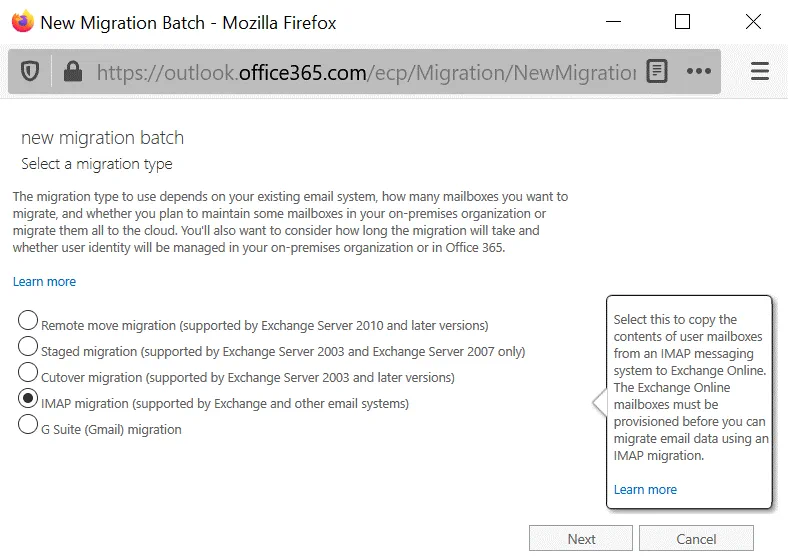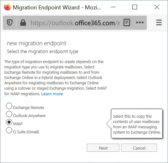 Select IMAP as a new migration endpoint type. Hit Next to continue.