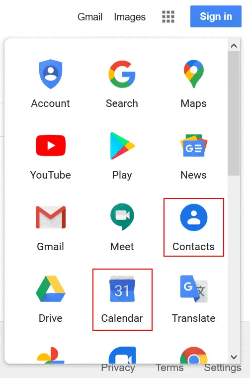 Open https://google.com, sign into your Google account, open the options menu, and click Calendar.