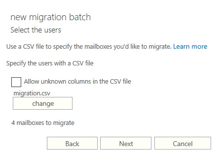 Select the created CSV file that contains a list of user accounts and their passwords by clicking the Browse button. After selecting the CSV file, the number of users recognized from the selected CSV file is displayed. On the screenshot below 4 mailboxes to migrate are selected.
