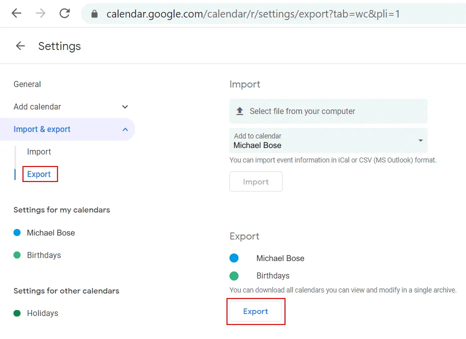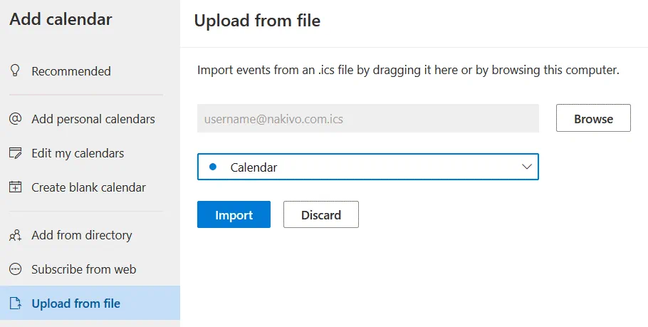 We are going to import a calendar from the exported file. Select Upload from file, click Browse and select the file you have extracted before: