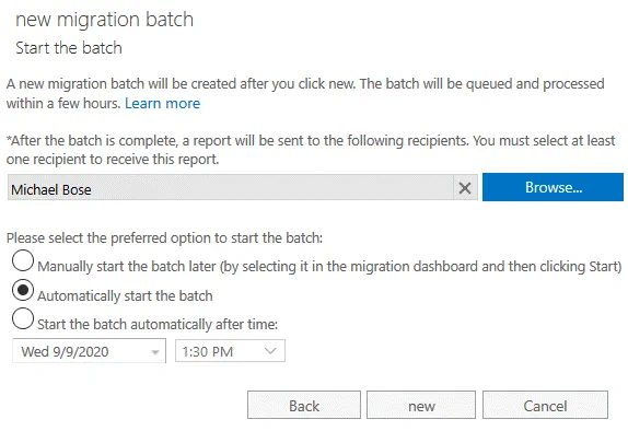 Select Automatically start the batch to start the batch and run the G Suite to Office 365 migration process immediately after completing this wizard.