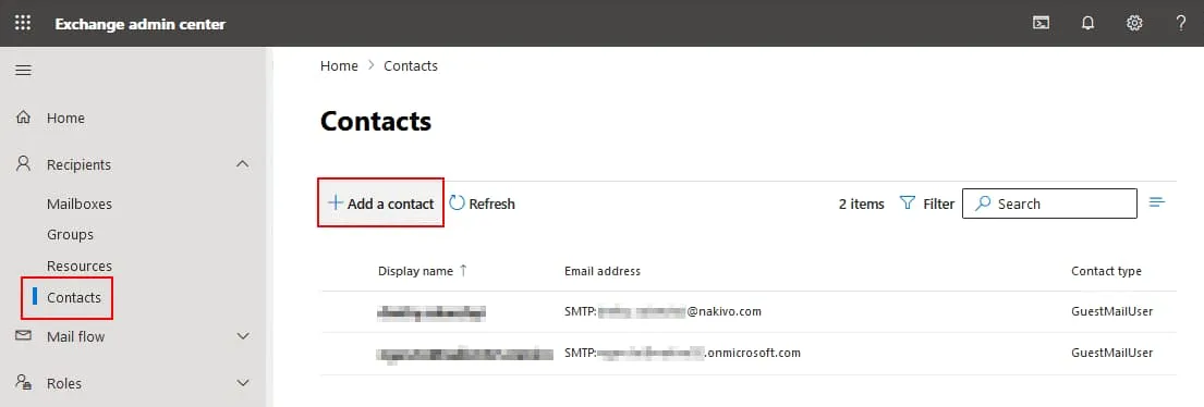 If you want to set up mail forwarding from an Office 365 account to another (external) email account in the Exchange admin center, you need to add a contact first. A contact contains an email address, user name, and other personal data of the user.