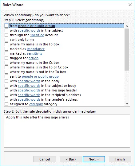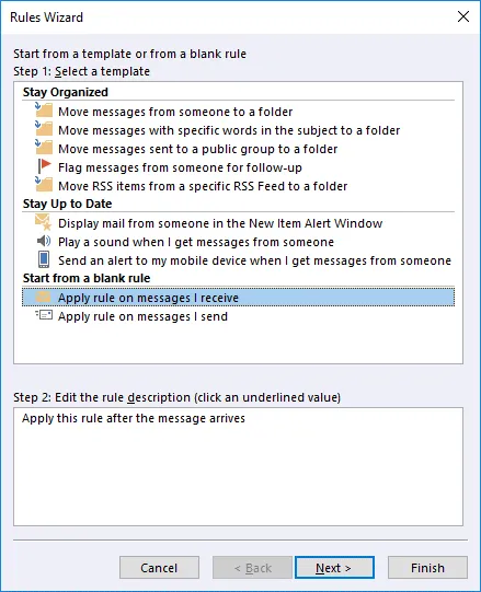 Select a template. Click Apply rule on messages I receive in the Start from a blank rule section. Hit Next at each step of the wizard to continue.