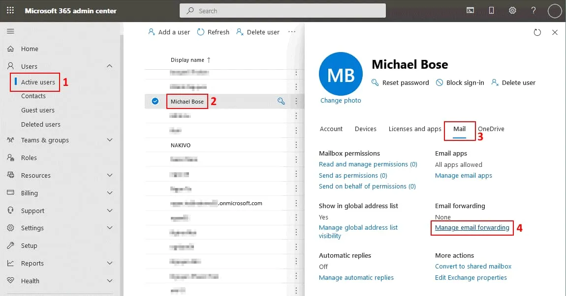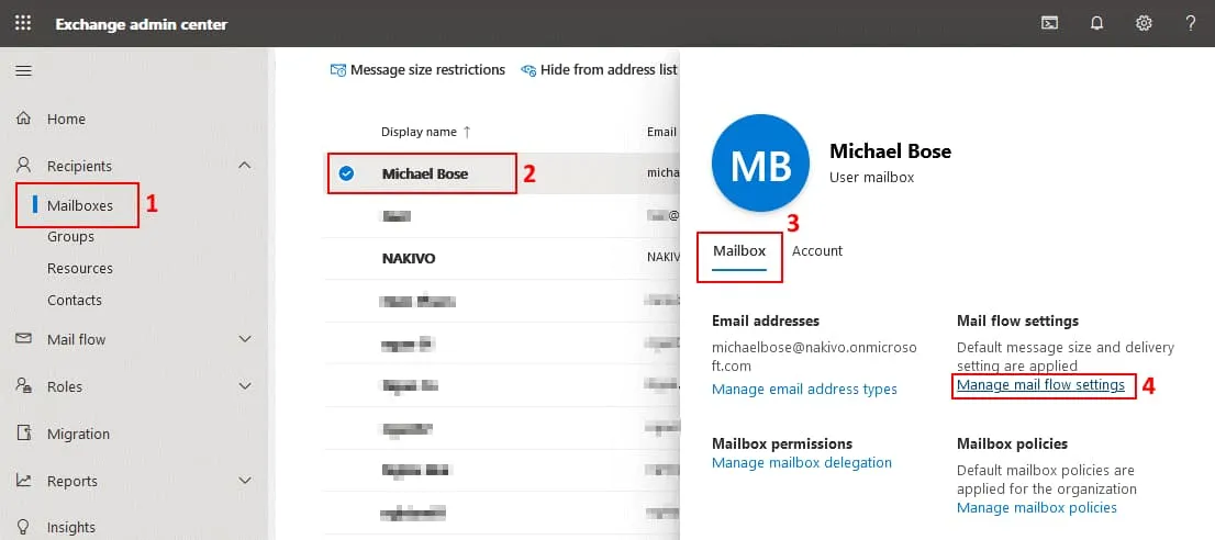 Let’s set up mail forwarding from the Office 365 account to another account in the Exchange admin center. Go to Recipients > Mailboxes in the navigation pane and select the needed Office 365 user account. Click the account name and in User mailbox details click Manage mail flow settings in the Mailbox tab.