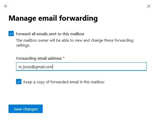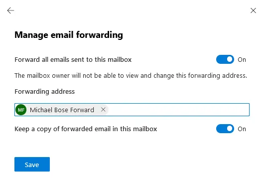 The external contact is now added and you can set up mail forwarding from an Office 365 account to another email account.