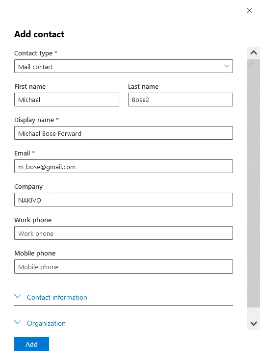 If you want to configure email forwarding from one Office 365 account to another Office 365 account within your organization, you don’t need to add a contact. You need to create a destination account and assign the Office 365 license (in this case you can skip the section about adding a contact and go to the next section).