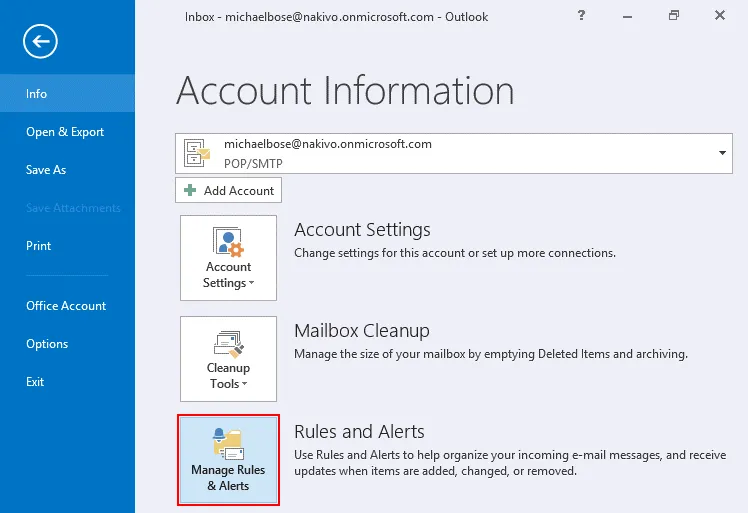 Open Microsoft Office Outlook installed on your computer, click File, select your Office 365 account in the drop-down menu, then hit Rules and Alerts.