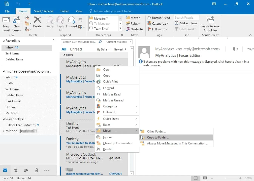 Open the email folder where Office 365 email messages are stored, for example, the Inbox folder. To select the needed messages, press Ctrl and click each message you need. Or press Ctrl+A to select all messages in the email folder. Right-click the selected message or group of messages and in the context menu click Move, then select one of the available options: