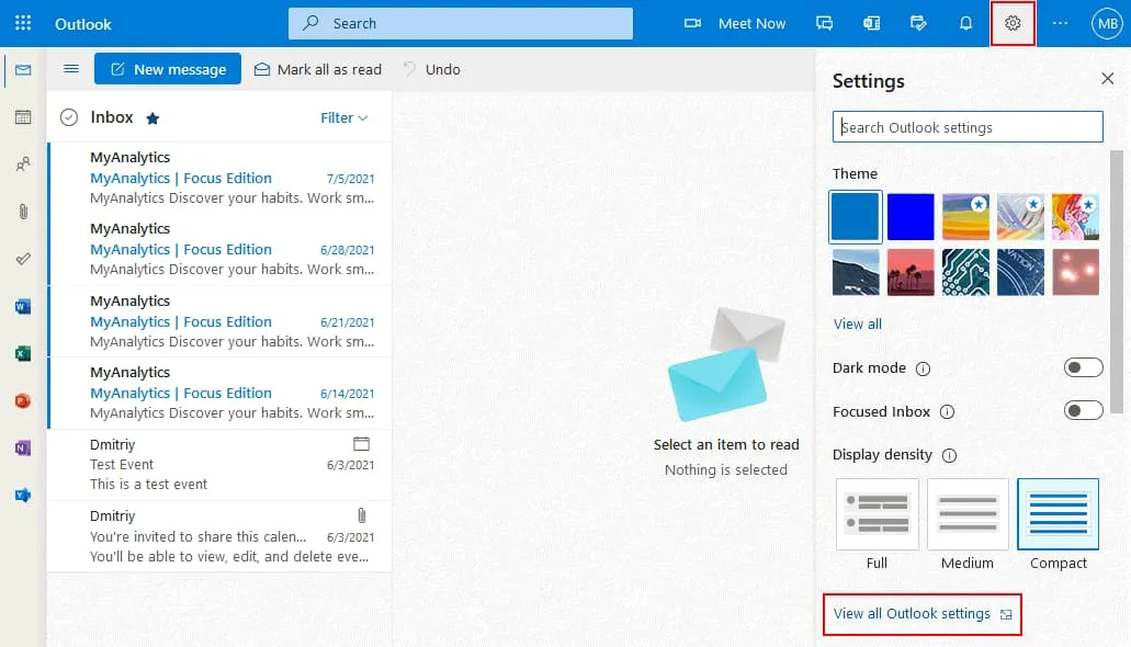 Click the settings icon in the top right corner of the web interface to open Office 365 email settings. Then at the bottom of the Settings pane, click View all Outlook settings.