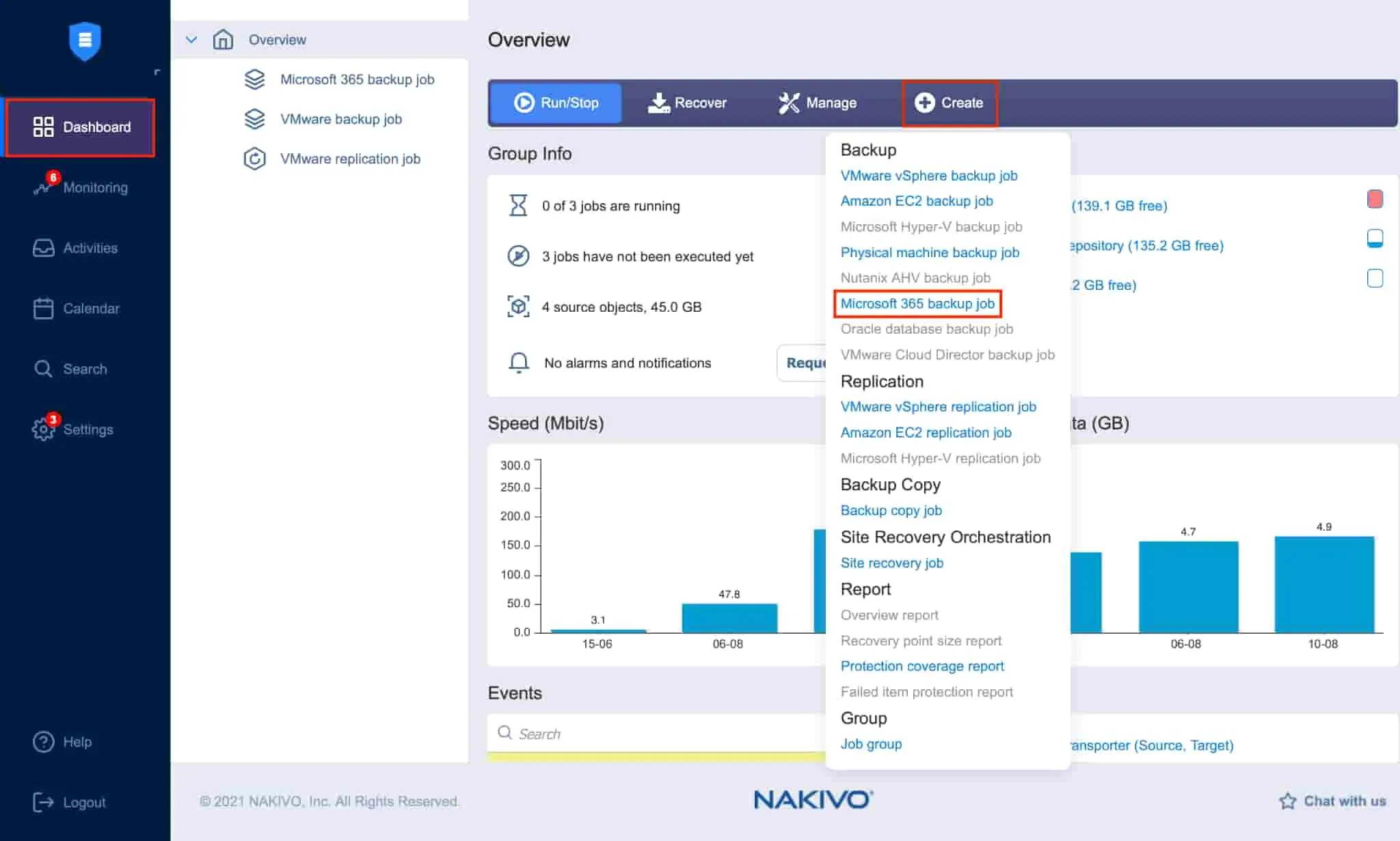 Start the backup job by opening the Dashboard in the solution’s web interface and clicking Create, then Microsoft 365 backup job.