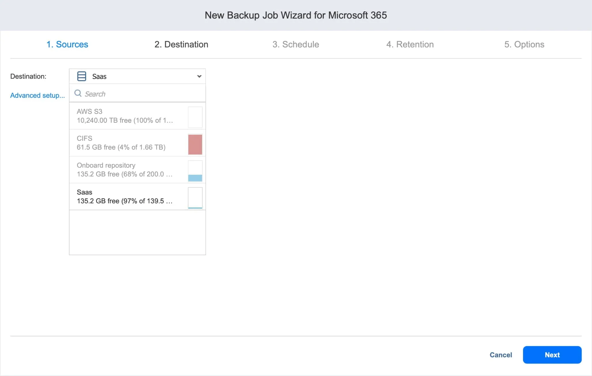- Destination: Specify the SaaS backup repository in which you want to store your backed up mailboxes and emails. You can set the same or different backup repositories for each item.