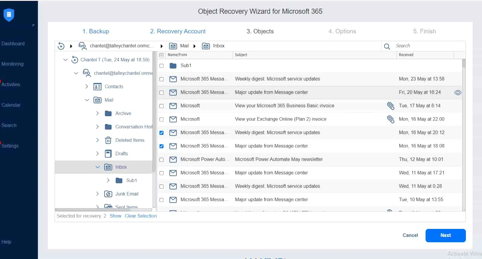 - Objects: Here you can view the contents of the mailbox at the time of the selected recovery point. You can drill down into mailbox folders, such as Inbox or Deleted Items, to view the list of email messages as well as open emails to view individual email message content. Search, view, and select the messages you wish to restore.