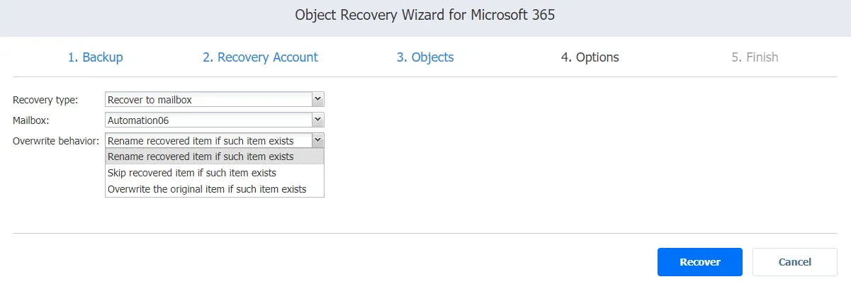 - Recovery account: Choose the Microsoft 365 account to which you want to recover your items from the drop-down list.