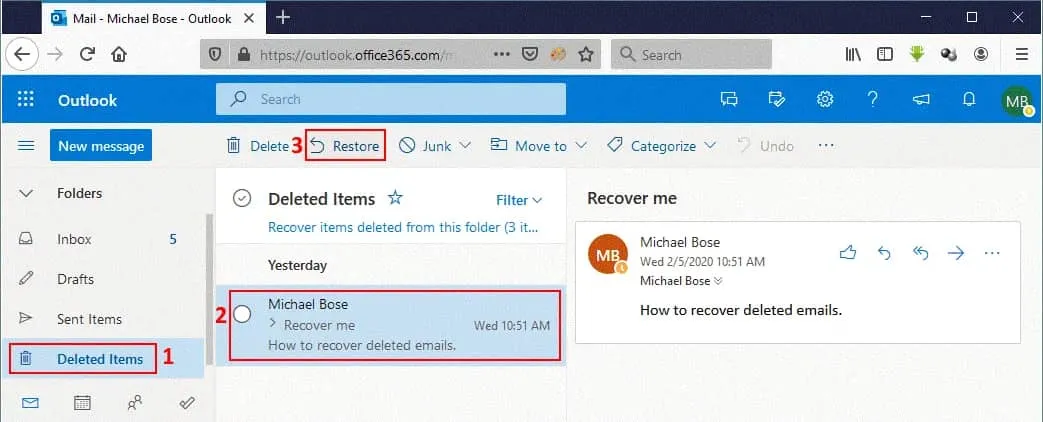 - Select the message you want to restore or select Deleted Items to restore all messages available here.