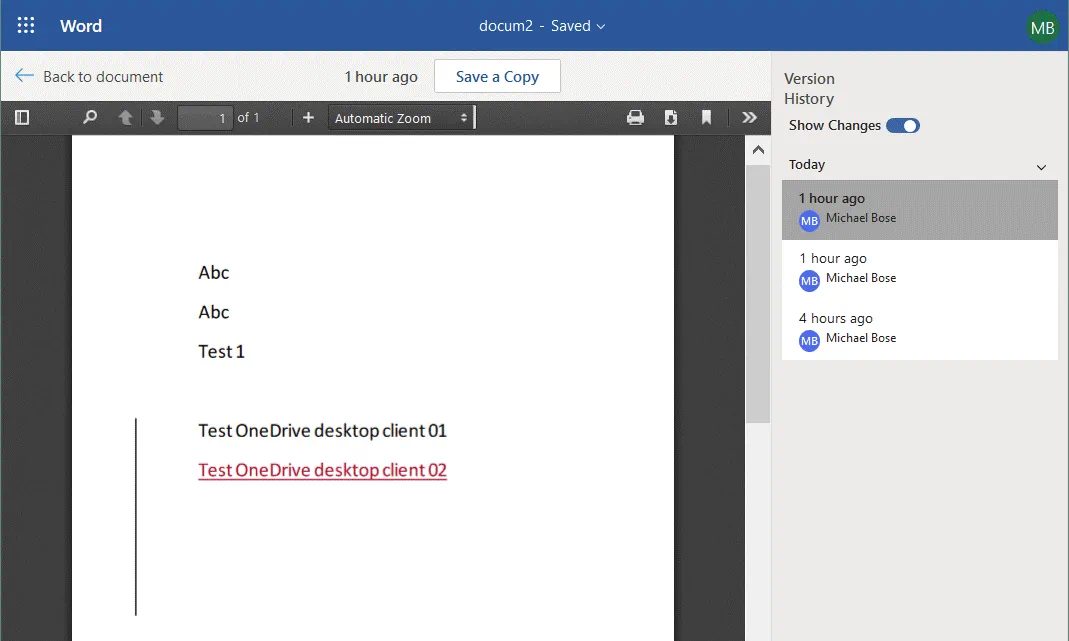 In our example, a document opens in Word Online in a web browser. In the right pane, you can select the needed file version and switch to the needed version. Changes are marked in the document in the main working area of the window. You can click Save a copy or Restore (the Restore button is not displayed for the latest version of the file).
