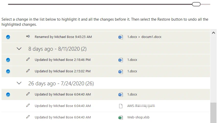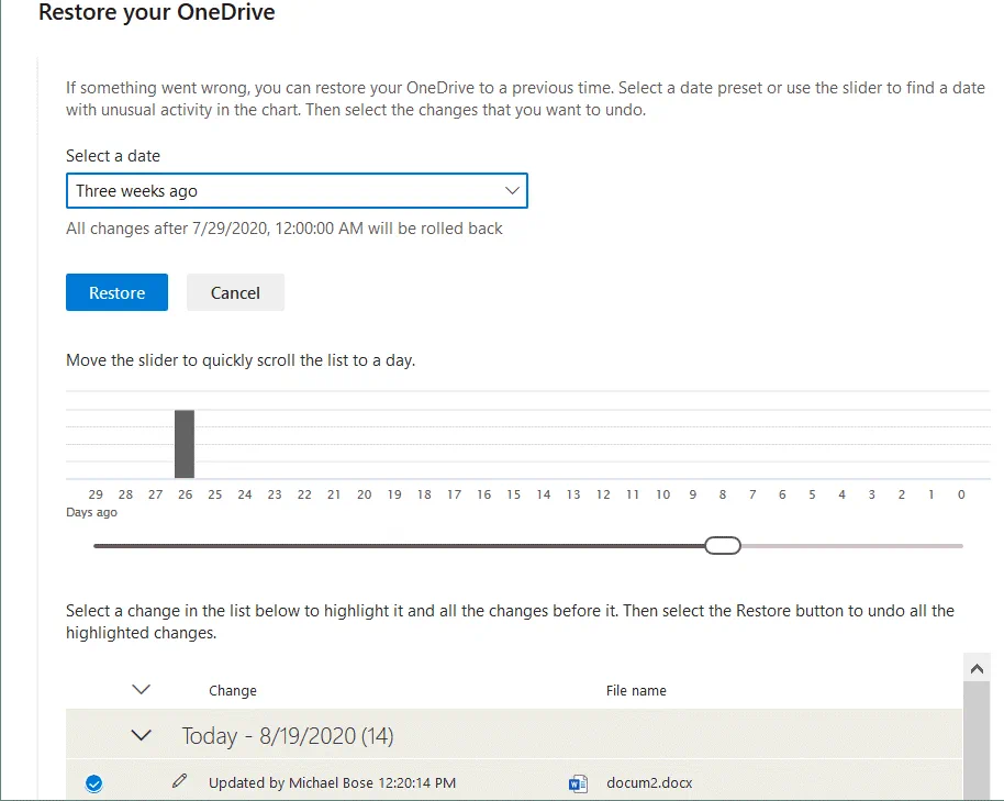 Below you can see a chart to detect the maximum activity in writing data to OneDrive and a slider to select the needed date for recovery.