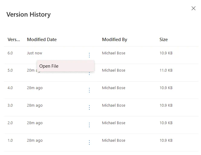 - In the window that opens, all available versions of the file are displayed with information about the modified date, the user who modified the file, and the file size. Select the file version that you want to restore, right click the needed file version, and, in the context menu, click Restore.In this example, I want to restore version 4.0 of our docum1.docx file (modified 23 minutes ago). As you can see on the screenshot below, there are 5 major versions of the file that can be restored. After restoring the needed file version, the current file version becomes a previous version.