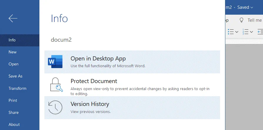 Then go to File > Info > Version History. On the screenshot below you can see this menu in Microsoft Word Online.